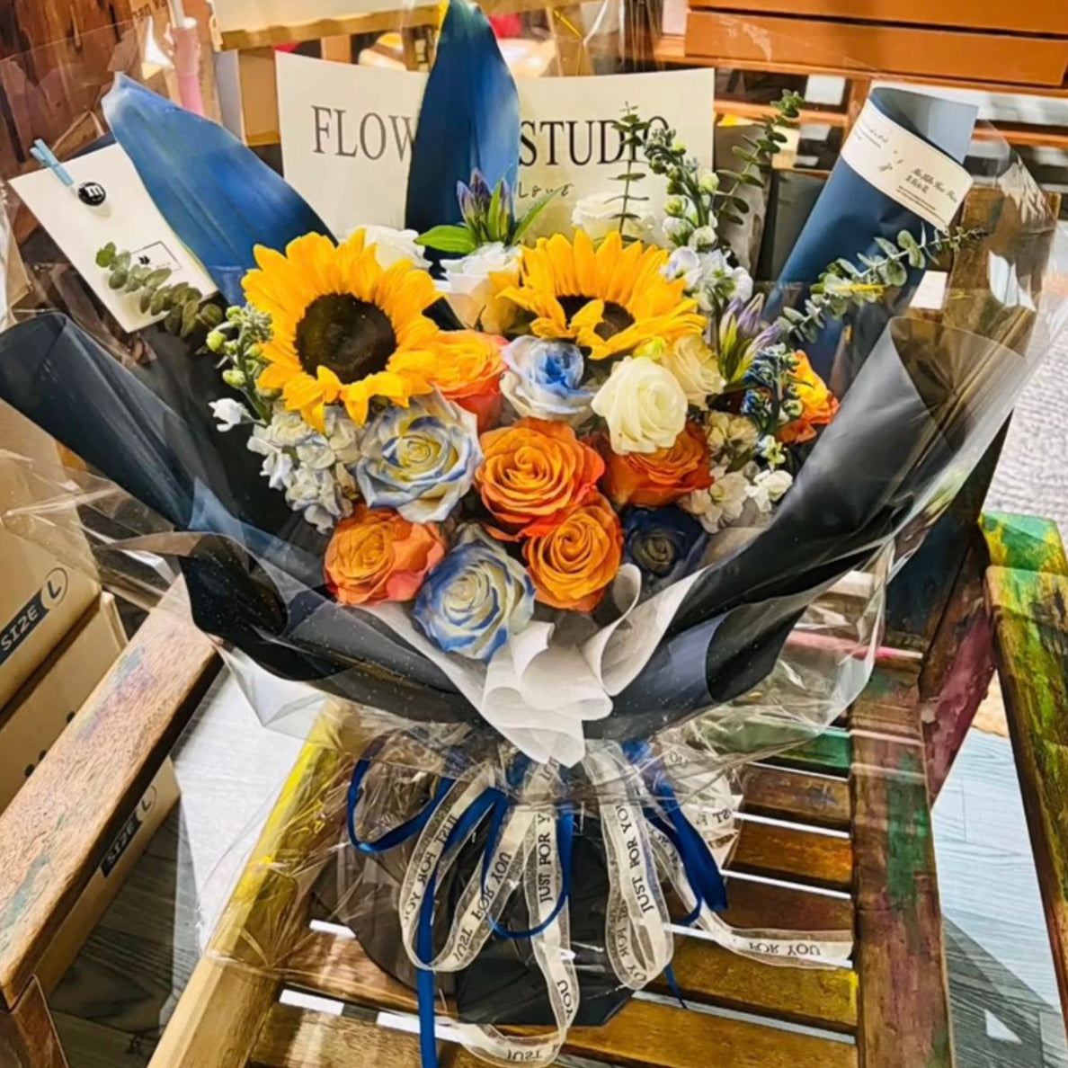 The Blue Blaze Bouquet is a bold and radiant fusion of warmth and cool elegance. Featuring bright sunflowers, fiery orange roses, soft blue-toned mattiola and roses, and accented with striking banana leaf spray, this bouquet brings together the brilliance of a sunset with the calm of a blue sky. Wrapped in a modern mix of black and transparent layers with a touch of blue, it exudes a vibrant, contemporary charm. Perfect for dynamic celebrations or confident gifting, Blue Blaze is a statement of energy, joy, and undeniable style.