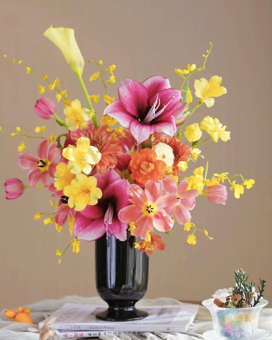 Bold, captivating, and refined, the Duskfire Elegance vase arrangement ignites the senses with a fiery yet graceful harmony of colors. Featuring deep pink Amaryllis, cheerful yellow oncidium orchids, delicate Alstroemeria, soft pink Tulips, and sculptural Calla Lilies, each bloom stands out against the dramatic allure of a sleek black vase. This arrangement evokes the fiery glow of sunset meeting the mystery of night—perfect for making a powerful and elegant statement.
