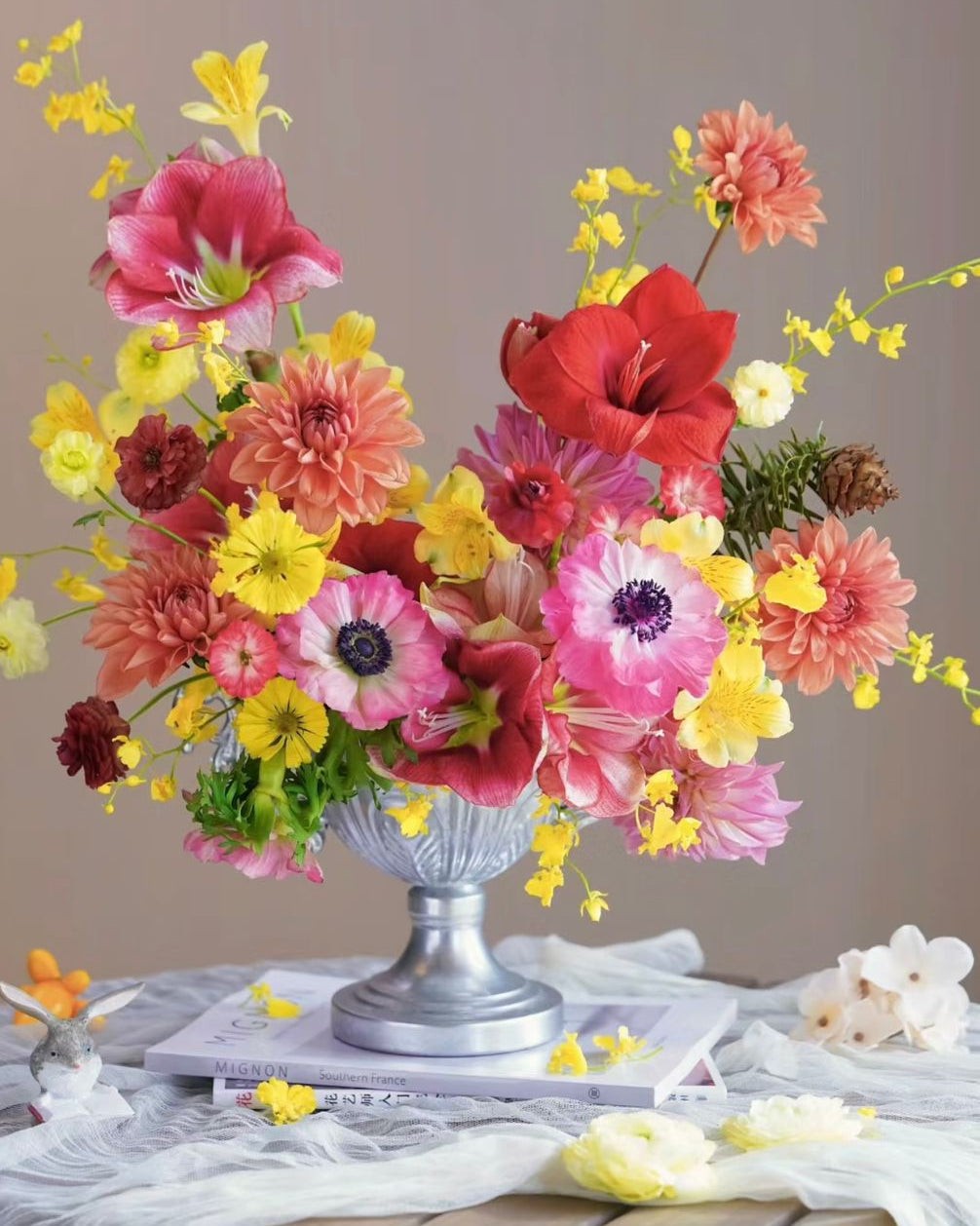 A radiant celebration of warmth and elegance, the Golden Embrace vase arrangement features the striking beauty of Amaryllis Mistral and lush Chrysanthemums ddahlias, accented by the graceful flair of yellow oncidium orchids. Set in a refined vase, this composition glows with golden hues and soft textures, evoking the feeling of a sun-kissed embrace. Perfect for brightening any space with charm, cheer, and timeless sophistication.